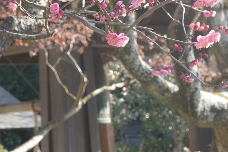 まだ3分咲きぐらいですが、本堂と青空にきれいな紅色の梅が彩ってくれました