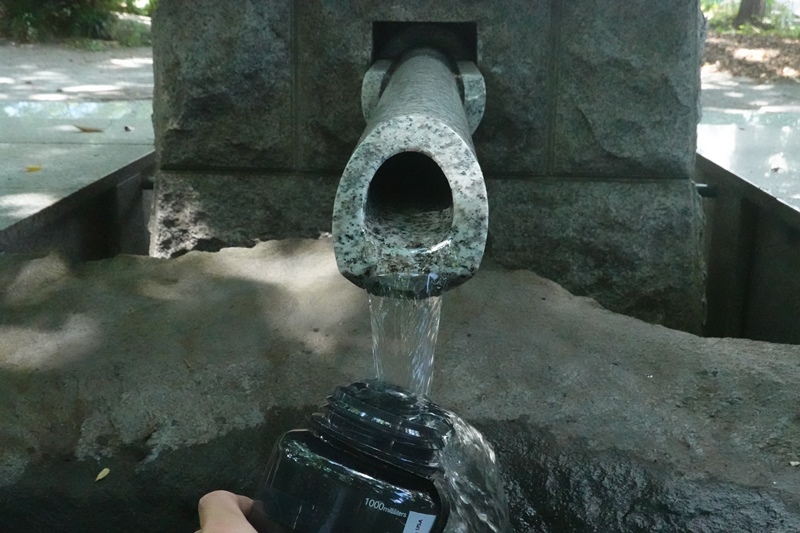 お詣り、御朱印、かき氷を受けたので、井之明神水(いのみょうじんすい)でお水取りに駐車場の方に戻ります